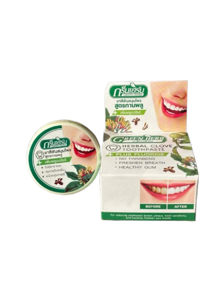 Green Herb Herbal Clove Toothpaste blends cloves, coconut oil, and a herbal tapestry to combat bad breath, reduce staining, ease tooth sensitivity, and curb bacteria for a fresher, brighter smile. A trusted, everyday option that’s easily accessible at stores and online in Thailand, designed to keep your mouth feeling clean and confident from morning till night.