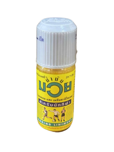 Namman Muay Boxing Oil is a traditional Thai liniment used by athletes and others for temporary relief from muscle aches, strains, and pains. Its formula is designed to provide a warming and soothing sensation that helps prepare muscles for physical activity or aid in recovery after exercise. In Thailand is very popular with Muay Thai fighters. The effectiveness of Namman Muay comes from its potent active ingredients including: Methyl Salicylate: A natural analgesic and anti-inflammatory agent, it is similar to aspirin and provides temporary pain relief for sore muscles, joints, and sprains. It also contributes to the oil’s distinctive warming effect. Then there’s Menthol which creates an initial cooling sensation that helps numb minor aches and pains. It also helps with vasodilation, increasing blood flow to the affected area.